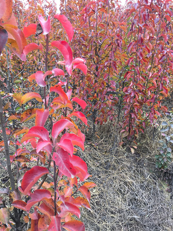基地里,彩葉豆梨的種植情況有點出乎意料。Z亮眼的是苗木種植的標準化,苗木整齊劃一,樹干筆直粗壯,分枝點一致,冠形優(yōu)美。偶然發(fā)現(xiàn)的幾株小苗尚未落葉,生長還旺盛,葉片仍然呈現(xiàn)亮紅色,耀眼奪目,由此可以想象此前這里曾是一片紅彤彤的美麗景象。