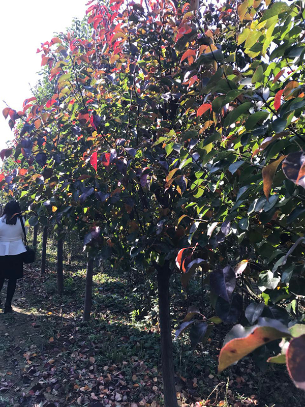 基地里,彩葉豆梨的種植情況有點(diǎn)出乎意料。Z亮眼的是苗木種植的標(biāo)準(zhǔn)化,苗木整齊劃一,樹干筆直粗壯,分枝點(diǎn)一致,冠形優(yōu)美。偶然發(fā)現(xiàn)的幾株小苗尚未落葉,生長(zhǎng)還旺盛,葉片仍然呈現(xiàn)亮紅色,耀眼奪目,由此可以想象此前這里曾是一片紅彤彤的美麗景象。