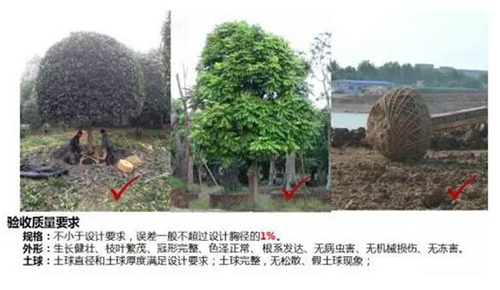 看規(guī)格:不小于設(shè)計(jì)要求,誤差一般不超過(guò)胸徑的1%。另外,當(dāng)喬木用作主景樹(shù)、樹(shù)陣、行道樹(shù)時(shí)候,冠幅誤差應(yīng)<30cm